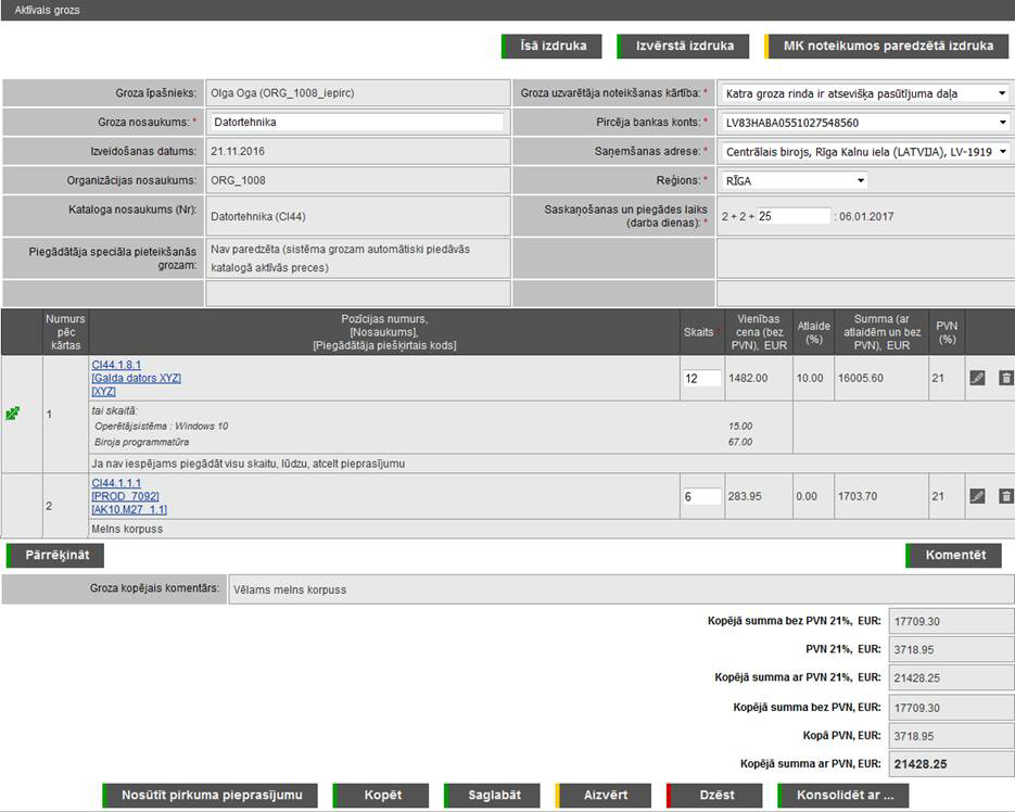 Pasūtījuma izveidošana ir iespējama, atverot lietotāja aktīvo grozu (skat. aprakstu Aktīvā groza apskatīšana), un izvēloties darbību pirkuma pieprasījuma izveidošanai.