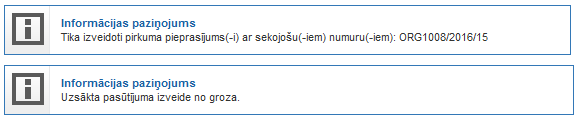 Ja pirkuma pieprasījums tiek veidots, kur vienumu skaits ir atbilstošs un visas iekļautās preces sasniedz minimālo pirkuma limitu, tiek izveidots Pasūtījums (skat. aprakstu Pasūtījuma apskatīšana un apstrāde|topic=Pasūtījuma apskatīšana un apstrāde), par to attēlojot informatīvu sistēmas paziņojumu: