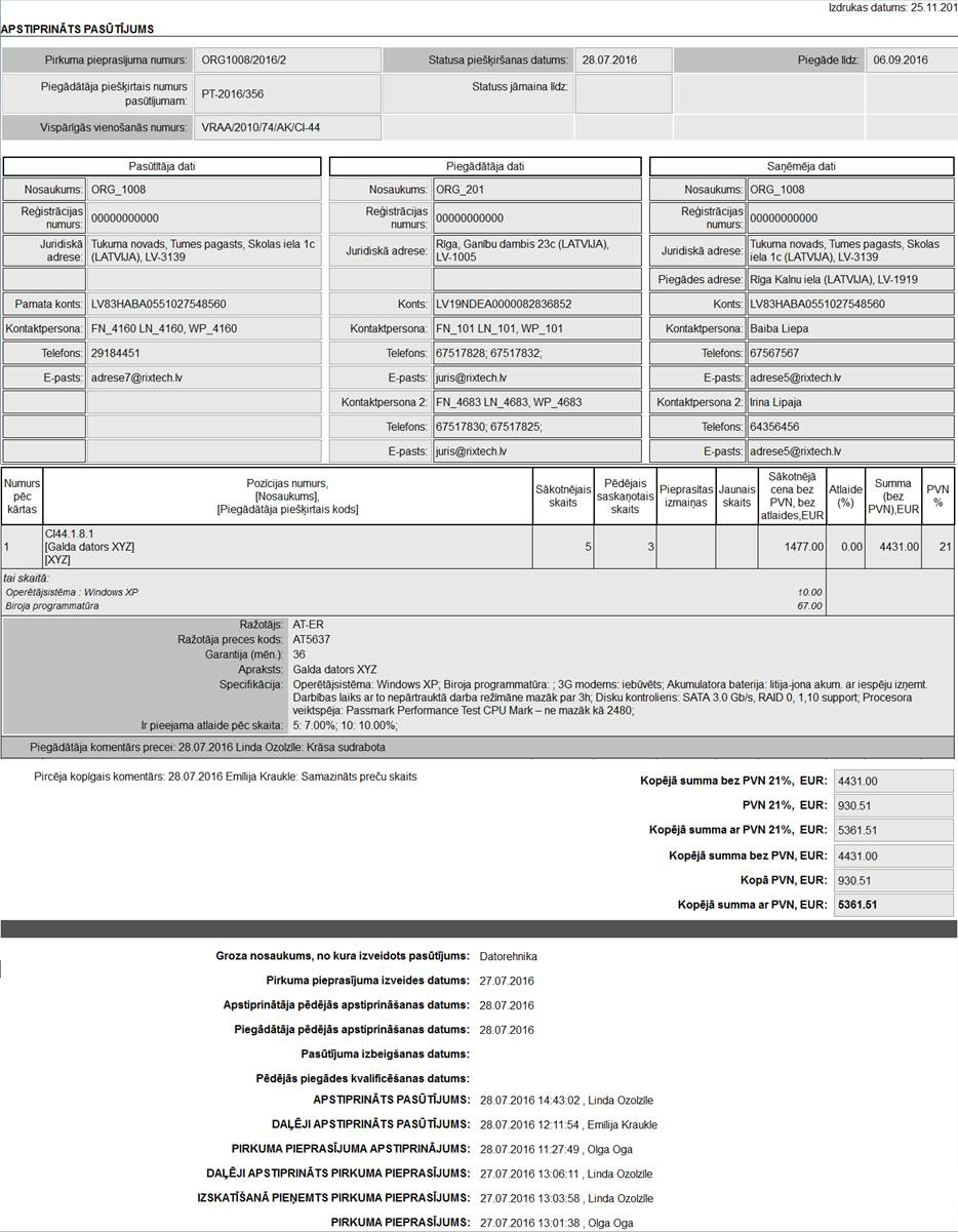 Piezīme! Izdrukā tiek iekļauta tā pati informācija, kas ir attēlota Pasūtījuma apskates ekrānformā (bez darbību spiedpogām), papildus attēlojot arī izdrukas sagatavošanas datumu un iekļaujot preču specifikācijas par katru pasūtījumā iekļauto preci.
