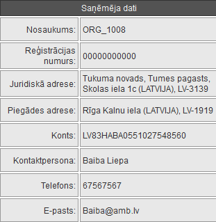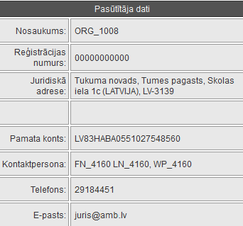 • Telefons - tiek attēloti pasūtītāja organizācijas (iepircēja organizācijas) juridiskās adreses kontaktpersonas dati – tālruņa numurs.