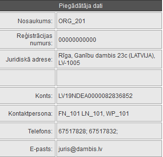 • Telefons - tiek attēloti piegādātāja organizācijas juridiskās adreses kontaktpersonas dati – tālruņa numurs.
