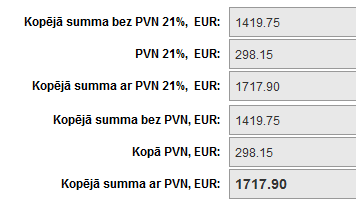 Piezīme! Tiek attēlotas arī atsevišķas kopējās summas bez PVN, PVN un ar PVN, ja kādai no precēm ir piemērots cits pievienotās vērtības nodoklis (PVN). Piemēram, ja ir preces, kurām PVN likme ir 5%, un kādai no precēm ir 20%, tad tām precēm zem preču saraksta tiek attēlota atsevišķi aprēķināta atbilstoši PVN likmei kopsumma un beigās tiek attēlota visām precēm kopējā summa. Ja pievienotajām precēm PVN likme sakrīt, tad tiek attēlota tikai viena kopējā summa.