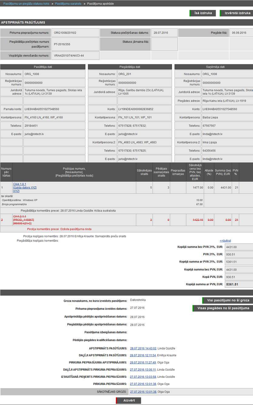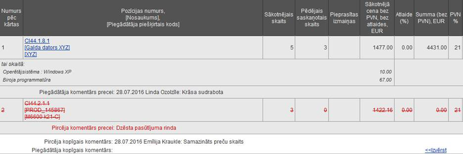§ Iepircēja komentārs precei grozā – tiek attēlots datums, kad komentārs pievienots, Iepircēja, kurš izveidoja grozu (no kura tālāk tika veidots iepirkums), vārds, uzvārds un pievienotais komentārs par preci grozā.