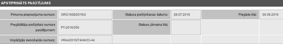 • Apstiprinātāja pēdējās apstiprināšanas datums – tiek attēlots datums, kurā Pasūtījumam piesaistītais Apstiprinātājs ir veicis pēdējo apstiprināšanu, ja Pasūtījumam šāda darbība ir veikta.