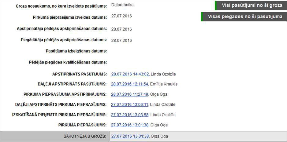 § Iepircēja komentārs grozam – tiek attēlots datums, kad komentārs pievienots, Iepircēja, kurš izveidoja grozu (no kura tālāk tika veidots iepirkums), vārds, uzvārds un pievienotais komentārs par grozu.