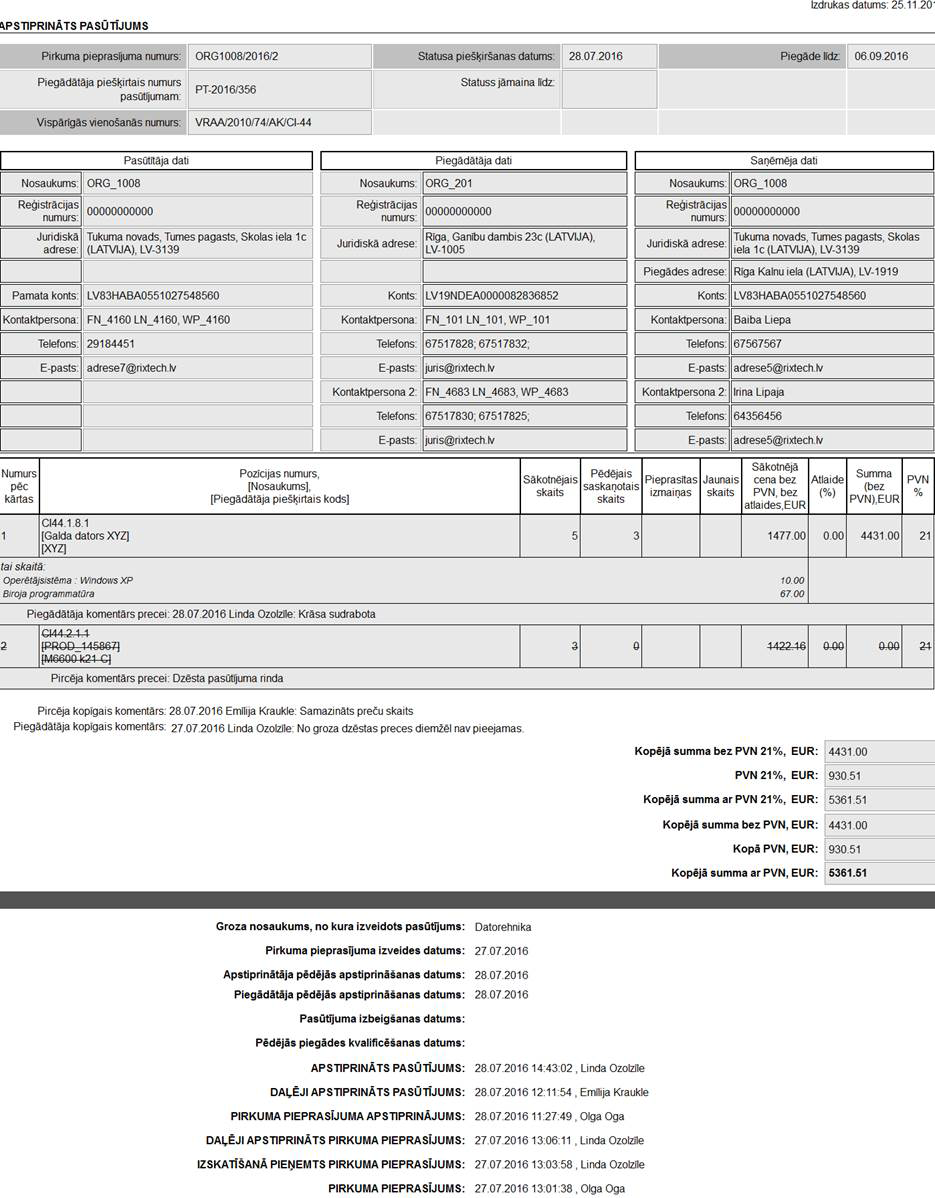 Piezīme! Izdrukā tiek iekļauta tā pati informācija, kas ir attēlota Pasūtījuma apskates ekrānformā (bez darbību spiedpogām), papildus attēlojot arī izdrukas sagatavošanas datumu.