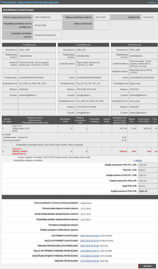 Ekrānforma 145. Pasūtījuma vēsturiskās informācijas apskate - piemērs