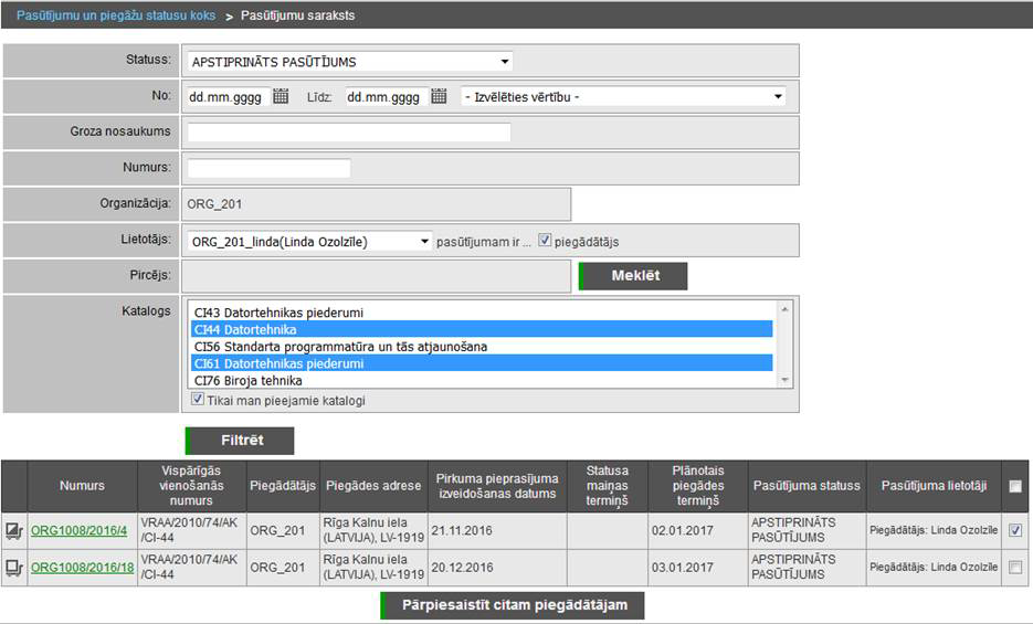• Lietotājs – organizācijas lietotāju izvēle. Atzīmējot izvēles rūtiņu, sistēma atlasīs pasūtījumus, kuros izvēlētais lietotājs ir Piegādātājs. Pircējiem atbilstoši iespēja atlasīt pasūtījumus, kuros izvēlētais lietotājs ir Iepircējs vai Apstiprinātājs.