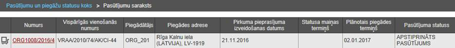 Piezīme! Ja pasūtījumu saraksts tiek atvērts no Pasūtījuma un piegāžu koka, tad saraksts tiek attēlots un atlasīts atbilstoši lietotāja izvēlētajam statusam.