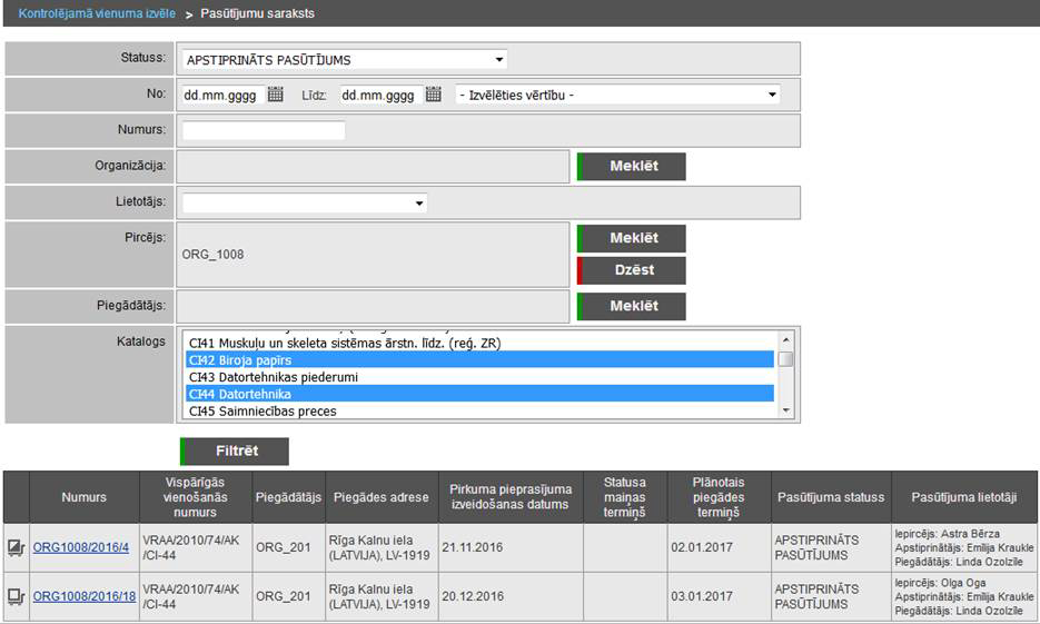 • Pircējs – iespēja norādīt noteiktu Pircēju organizāciju, lai skatītu šīs organizācijas pasūtījumus. Sk. organizācijas atlasi pie meklēšanas kritērija Organizācija apraksta.