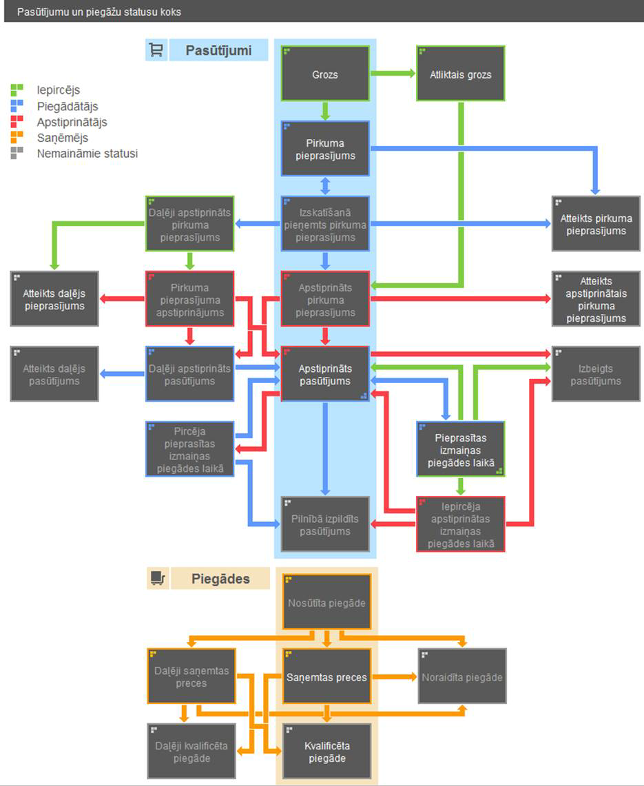 Visiem tiem statusiem, kuros ir iespējama kādas lietotāja lomas darbība ar pasūtījumu vai piegādi, tiek attēlota noteikta krāsa, kas atbilst darbības veicēja krāsai (lietotāju lomu krāsas ir paskaidrotas koka sākuma daļā).