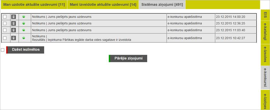 Lai skatītu paziņojumu sarakstu, lietotājam jāuzklikšķina uz šķirkļa „Paziņojumi” sistēmas galvenajā izvēlnē un jāatver šķirklis „Sistēmas ziņojumi”.