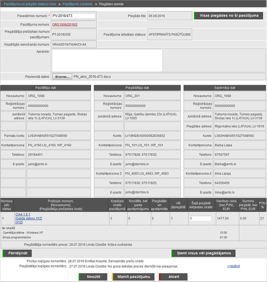 Piegādātāja dati tiek attēloti analoģiski kā pasūtījumam esot statusā „Pirkuma pieprasījums” (skat. ekrānformas aprakstu Pasūtījuma apskatīšana un apstrāde|topic=Pasūtījuma apskatīšana un apstrāde statusā ‘Pirkuma pieprasījums’).