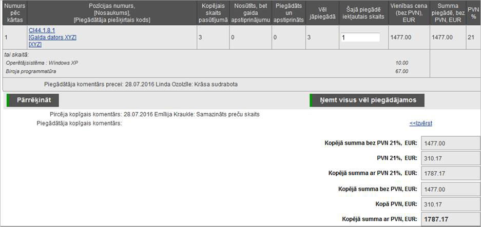 piegādes rindām. Papildus tiek veikts piegādes summu pārrēķins ar norādītajiem