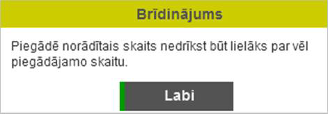 § Ja kādai piegādes rindai norādītais ‘Šajā piegādē iekļautais skaits’ ir norādīta vērtība, kas pārsniedz iespējamo, vēl piegādājamo skaitu, sistēma pie piegādes izveides attēlo brīdinājuma paziņojumu: