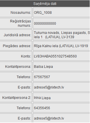 •Telefons - tiek attēloti piegādātāja organizācijas juridiskās adreses kontaktpersonas dati – tālruņa numurs.
