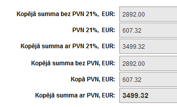 Piezīme! Tiek attēlotas arī atsevišķas kopējās summas bez PVN, PVN un ar PVN, ja kādai no precēm ir piemērots cits pievienotās vērtības nodoklis (PVN). Piemēram, ja ir preces, kurām PVN likme ir 5%, un kādai no precēm ir 20%, tad tām precēm zem preču saraksta tiek attēlota atsevišķi aprēķināta atbilstoši PVN likmei kopsumma un beigās tiek attēlota visām precēm kopējā summa. Ja pievienotajām precēm PVN likme sakrīt, tad tiek attēlota tikai viena kopējā summa.