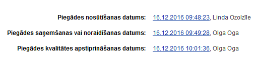 •Ar piegādi veiktā darbība – tiek attēlotas ar piegādi veiktās darbības, sakārtojot statusus to iestāšanās secībā. Katrai darbībai tiek attēlots Ar piegādi veiktās darbības datums un laiks, kad konkrētā darbība ar Piegādi tika veikta, kas tiek attēlots kā hipersaite. Aiz hipersaites tiek attēlots lietotāja vārds un uzvārds, kas konkrēto darbību Piegādei ir veicis. Uzklikšķinot hipersaitei, tiek attēlota Piegādes vēsturiskā informācija, lietotāja izvēlētajā statusā (skat. aprakstu Piegādes vēsturiskās informācijas apskatīšana kontrolei|topic=Piegādes vēsturiskās informācijas apskatīšana kontrolei).