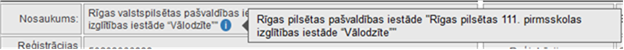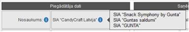 •Nosaukums - tiek attēlots piegādātāja organizācijas nosaukums. Ja Organizācijai sistēmā ir reģistrēts arī vēsturisks nosaukums, tad pie organizācijas nosaukuma attēlota ikona , uz kuru pozicionējot peles kursoru, attēlots vēsturiskais nosaukums.