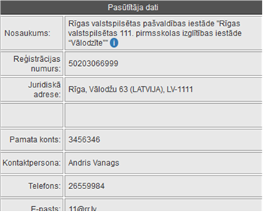 •Telefons - tiek attēloti pasūtītāja organizācijas (iepircēja organizācijas) juridiskās adreses kontaktpersonas dati – tālruņa numurs.