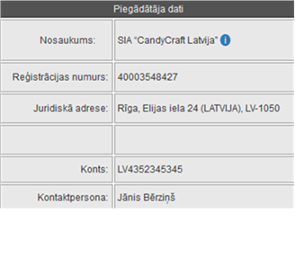 •Kontaktpersona - tiek attēloti piegādātāja organizācijas juridiskās adreses kontaktpersonas dati – vārds un uzvārds. Papildus attēlo kontaktpersonas amatu un struktūrvienību, ja šie dati sistēmā ir norādīti.