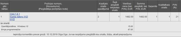 § Iepircēja komentārs precei grozā – tiek attēlots datums, kad komentārs pievienots, Iepircēja, kurš izveidoja grozu (no kura tālāk tika veidots iepirkums un piegāde), vārds, uzvārds un pievienotais komentārs par preci grozā.