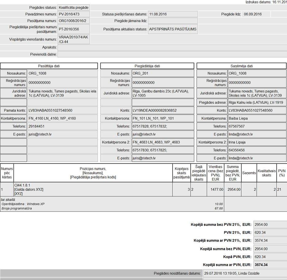 Piezīme! Izdrukā tiek iekļauta tā pati informācija, kas ir attēlota Piegādes apskates ekrānformā (bez darbību spiedpogām), papildus attēlojot arī izdrukas sagatavošanas datumu.