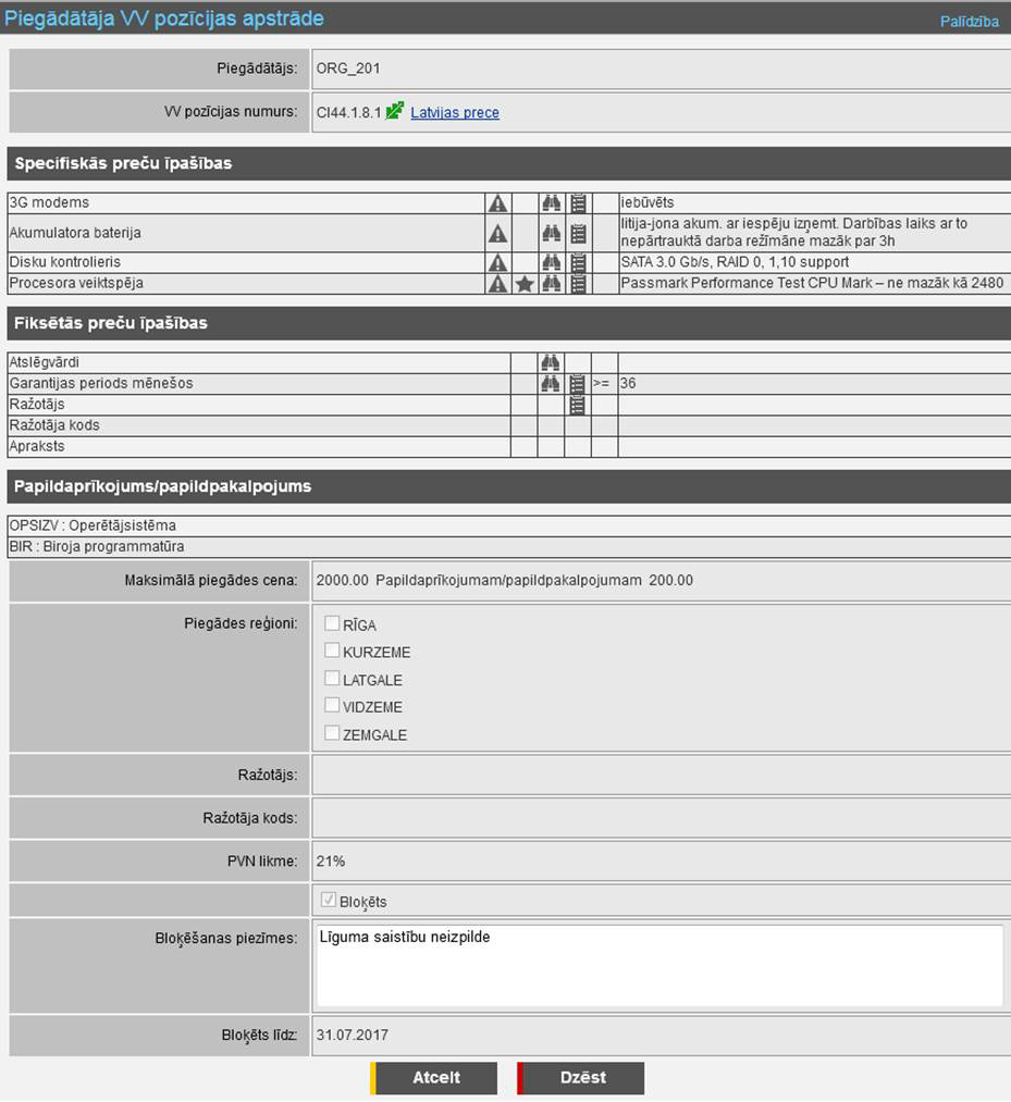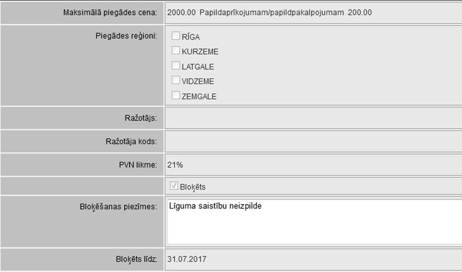 • Bloķēts – izvēles rūtiņa, kuru atzīmējot, tiek norādīts, ka konkrētais piegādātājs VV pozīcijā ir bloķēts.
