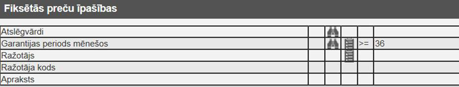 Fiksēto preču īpašību sarakstā tiek attēloti ievadlauki: