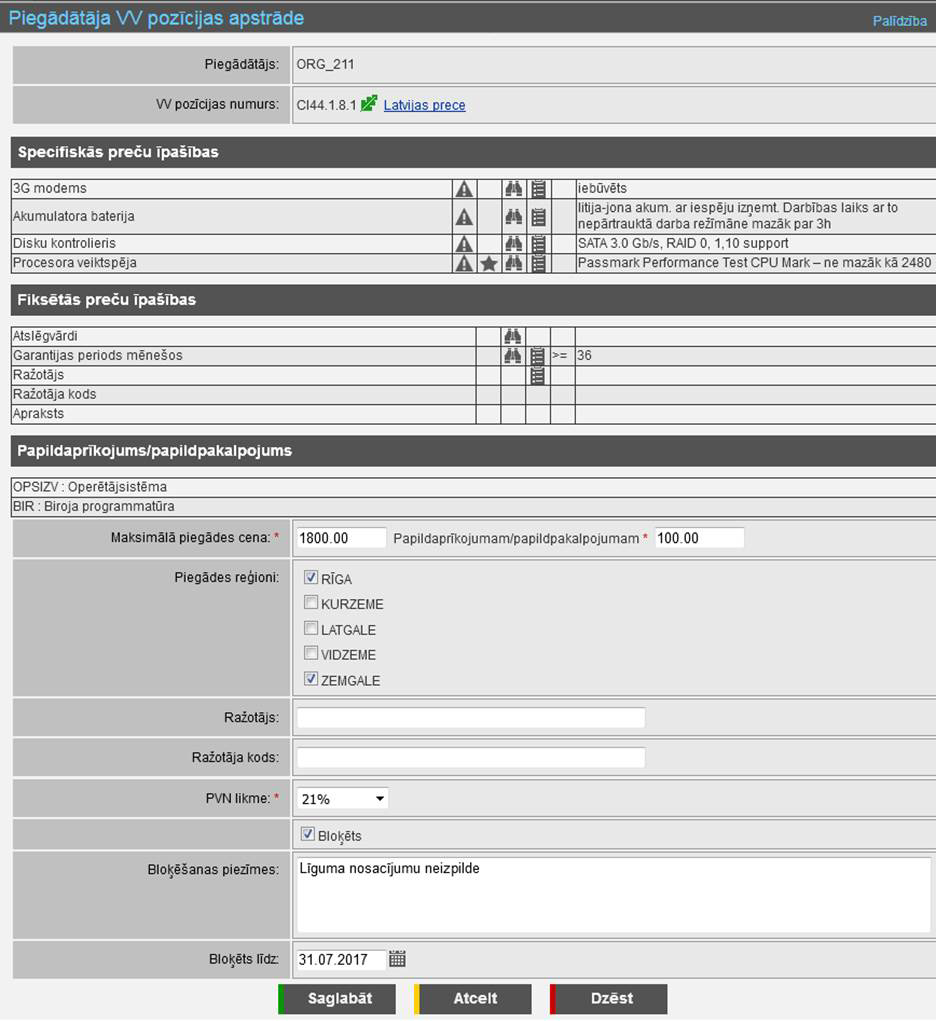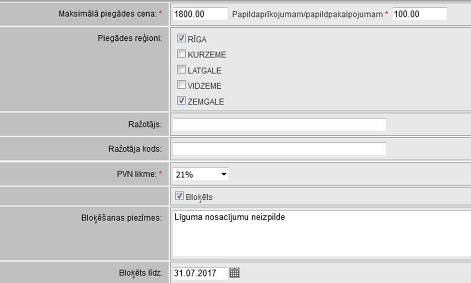 • Bloķēts – izvēles rūtiņa, kuru atzīmējot, tiek norādīts, ka Piegādātājs VV pozīcijā ir bloķēts.