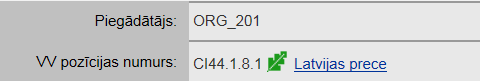 • Piegādātājs – piegādātāja organizācijas nosaukums, kas tiek attēlots kā hipersaite, uz kuras uzklikšķinot tiek atvērta ‘Piegādātāja VV pozīcijas apstrāde’ (skat. aprakstu Piegādātāja VV pozīcijas pievienošana|topic=Piegādātāja VV pozīcijas pievienošana vienam piegādātājam);