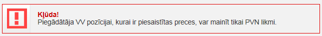 Pie saglabāšanas sistēma veic pārbaudi un ja piegādātāja VV pozīcijai ir piesaistīta preces, tad sistēma attēlo kļūdas paziņojumu: