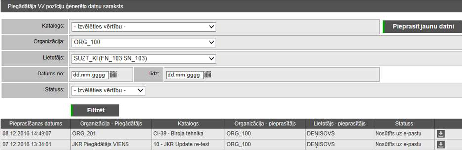 Piegādātāja VV pozīciju ģenerēto datņu saraksts ir pieejams autorizētiem sistēmas lietotājiem ar lomu – Katalogu administrators, Kataloga vadītājs un Piegādātājs.