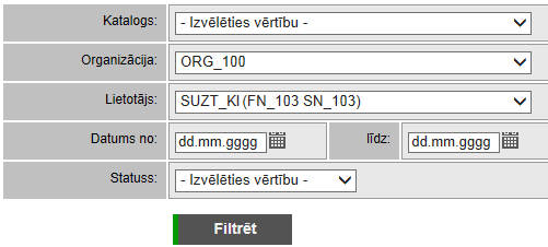 Piezīme! Ja filtrēšanas parametros norādītā organizācija nav sistēmas uzturētājs, tad filtrēšanas parametros var tikt norādīts tikai tāds Katalogs, uz kuru norādītajai organizācijai-piegādātājām ir dalības nosacījums (aktīvs vai neaktīvs).