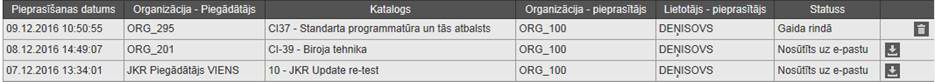 Piezīme! Ja pašreizējais sistēmas lietotājs nav ar lomu ‘Kataloga vadītājs’ vai ‘Kataloga administrators’, tad viņš nevar dzēst vai lejupielādēt no eksportējamo preču rindas datni, kuras pieprasītājs (lietotājs, kas veica tās pieprasījumu) ir no citas organizācijas.