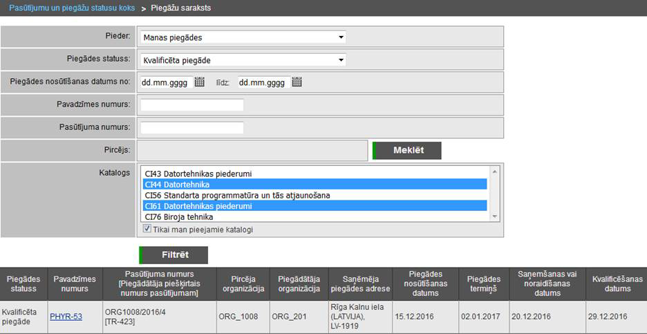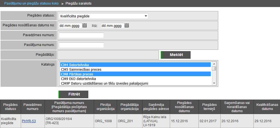 Sistēma nodrošina iespēju saraksta veidā apskatīt piegādes, kuras pieejamas sistēmas lietotājam, ja šīm piegādēm atbilstošā pasūtījuma statuss ir „Apstiprināts pasūtījums”.