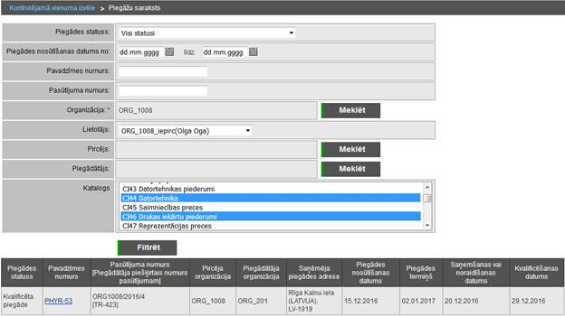 Sistēmas lietotājs filtrēšanas blokā veic atlases kritēriju norādīšanu. Lietotājam veicot filtrēšanu, tiek attēlots organizācijas piegāžu saraksts atbilstoši norādītajiem atlases kritērijiem.
