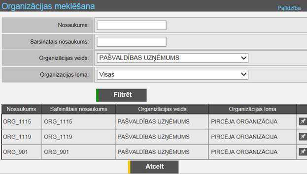 kritērijiem atrod kādu organizāciju, tad to attēlo zem filtrēšanas bloka