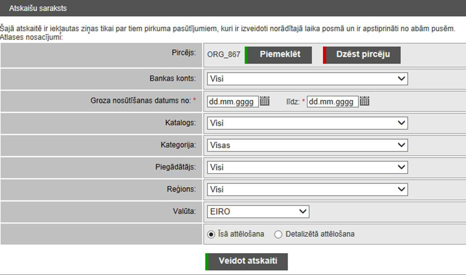 • Banka konts – kā izvēle no Pircēja organizācijas banku kontu numuriem, kas sakārtoti alfabēta secībā. Papildus kā noklusētā vērtība tiek attēlota arī vērtība „Visi”, kas apzīmē atskaites veidošanu pa visiem pircēja bankas kontiem.