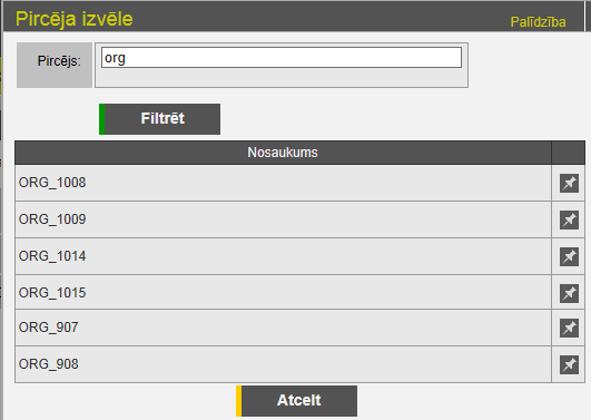 Piezīme! Atverot Pircēja izvēles ekrānformu, tiek attēlots tikai organizācijas filtrs, bez atlasītiem datiem. Lai iegūtu organizāciju sarakstu, ir jāveic filtrēšana.