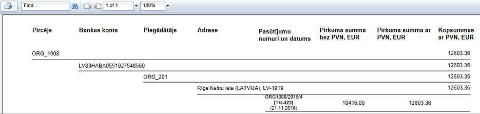 • Bankas konts – tiek attēlots konkrētās Pircēja organizācijas bankas konta numurs. Ja atskaitē ir iekļauti dati par vairākiem organizācijas banku kontiem, tad šī ir otrā kolona, pēc kuras tiek veikta atskaites datu un kopsummu grupēšana, Banku kontu numurus kārtojot alfabēta secībā.