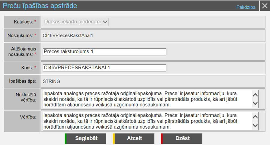 Sistēmā tiek nodrošināta iespēja rediģēt precēm piemērojamās Kataloga preču īpašības datus.