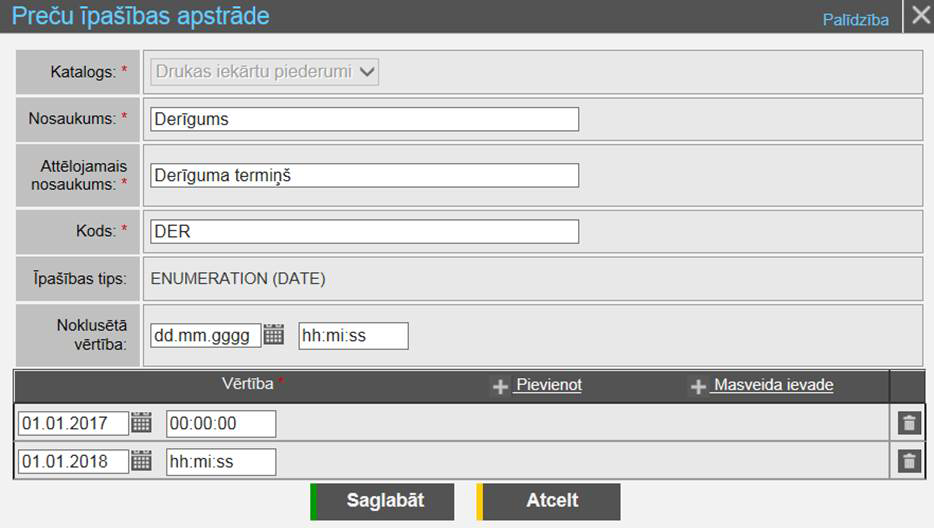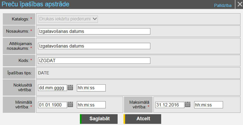 Piezīme! Ja preču īpašības tips ir ‘datums’ (date), tad Minimālajai vērtībai un Maksimālajai vērtībai ir jābūt eksistējošam datumam, ja šie lauki tiek aizpildīti.