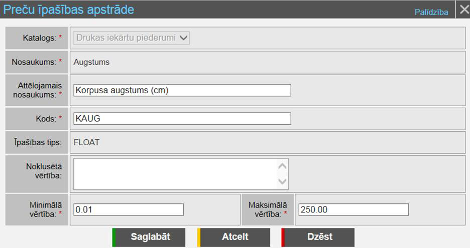 Piezīme! Ja preču īpašības tips ir ‘decimālskaitlis’ (float), tad Minimālajai vērtībai un Maksimālajai vērtībai ir jābūt decimālskaitlim, ja šie lauki tiek aizpildīti.