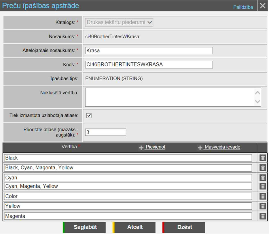 Piezīme! Lauku ‘Vērtība’ nedrīkst ne rediģēt, ne dzēst, ja preču īpašība ir piesaistīta preču veidam, kas piesaistīts Kategorijai, kurā ir kaut viena prece.
