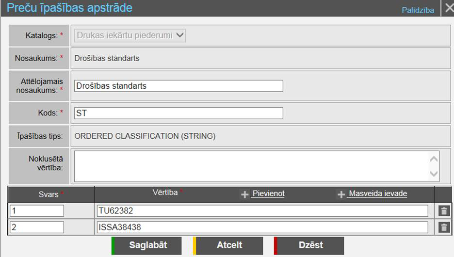 Piezīme! Ja ir norādīta preču īpašības ‘Noklusētā vērtība’, tad laukam ‘Vērtība’ ir jābūt aizpildītam, un tam ir jābūt vienādam ar Noklusēto vērtību.