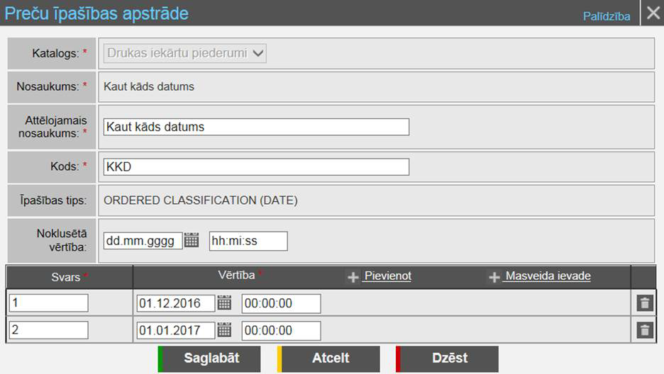 Piezīme! Ja preču īpašības tips ir ’datums’ (date), pārskaitījums vai klasifikācija no datumiem (enumeration (date), ordered classification (date), grouped classification (date)), tad Noklusētajai vērtībai, ir jābūt eksistējošam datumam, ja šis lauks tiek aizpildīts.