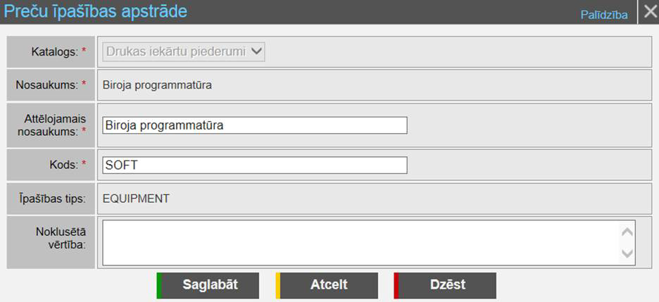 Piezīme! Lietotājam ir iespēja rediģēt tikai Kataloga preču īpašības (jeb specifiskās īpašības). Preču īpašības, kuras netiek definētas noteiktam Katalogam, bet ir pielietojamas visiem Katalogiem (fiksētās preču īpašības), ir definētas sistēmā un nav rediģējamas.