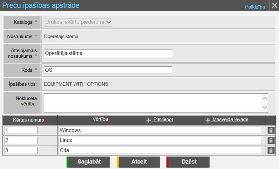 • Katalogs – kā atspējota izvēle, kurā lietotājam tiek attēlots tā Kataloga nosaukums, kura ietvaros jaunā preču īpašība ir pievienota. Piesaisti Katalogam nav iespējams mainīt.