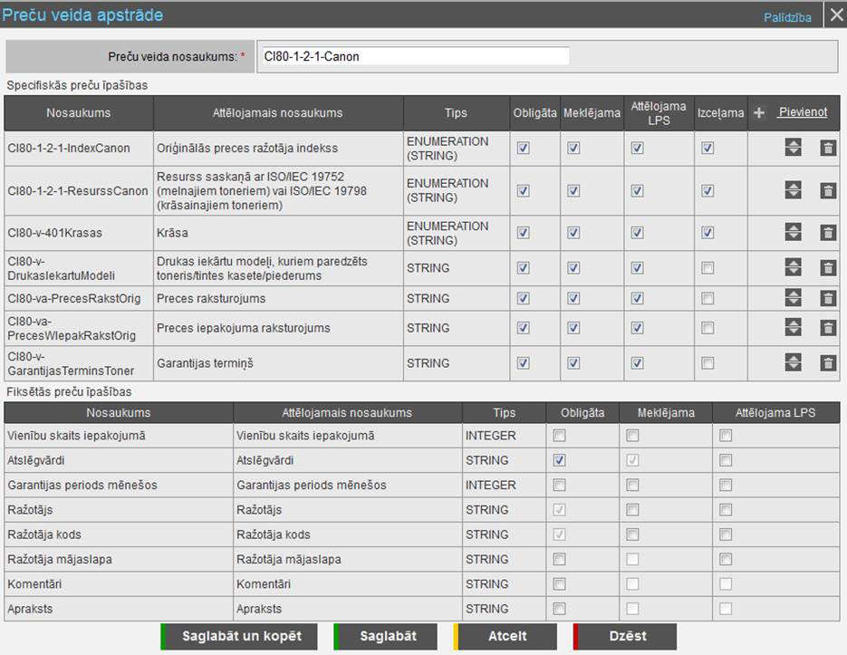 • Obligāta – tiek attēlots pazīmes lauks, lai norādītu vai fiksētā īpašība ir obligāti aizpildāma šim preču veidam.